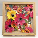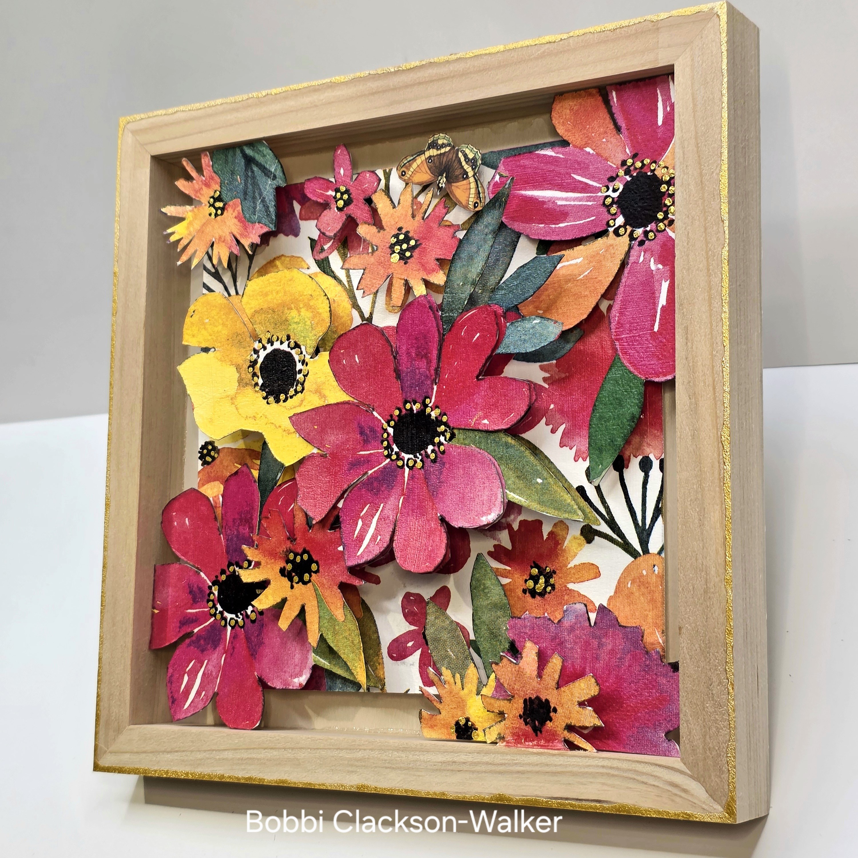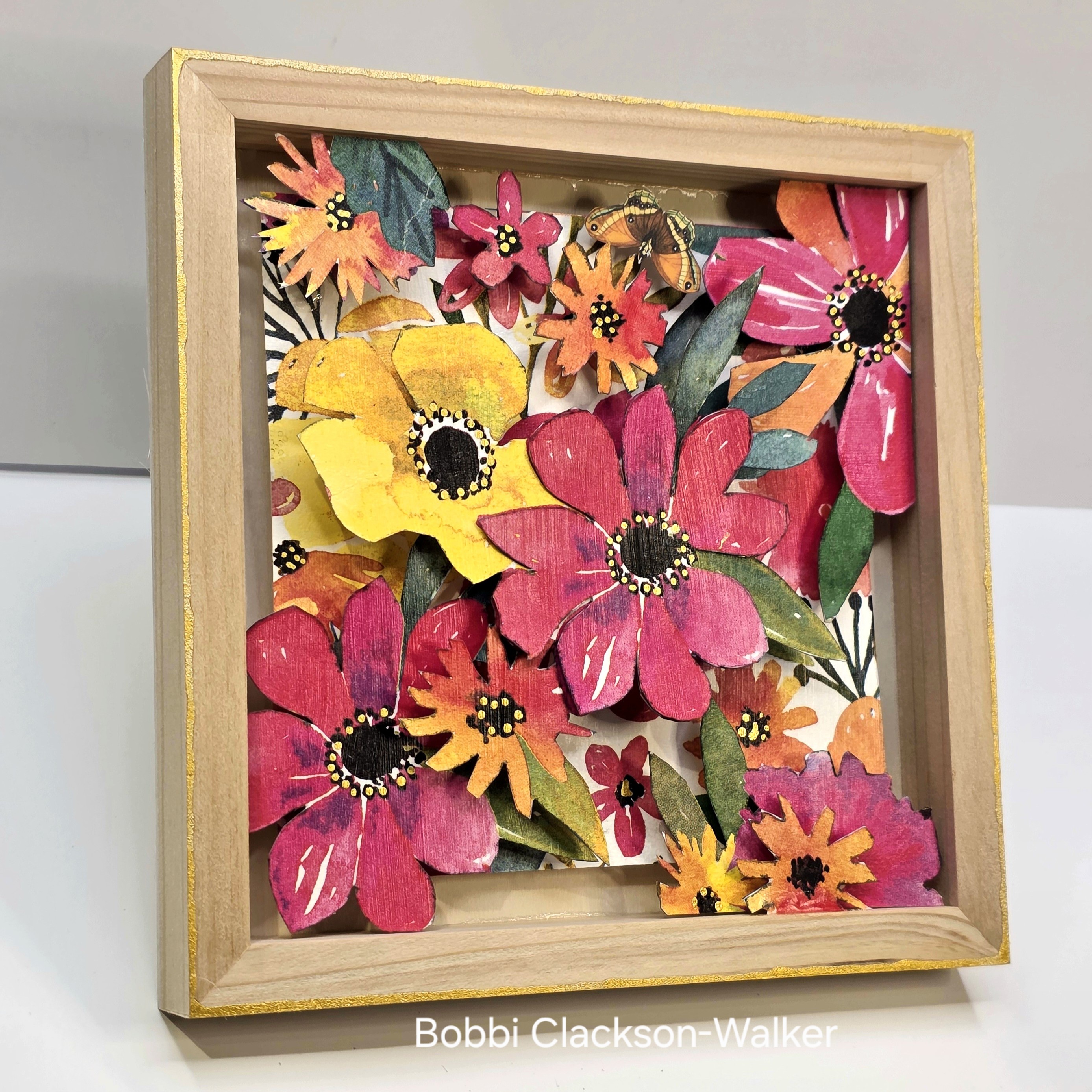 Colorful flora with a companion pollinator are hand cut and suspended in this framed dimensional papercut. The paper sculpture is finished with a moisture barrier coating. The artwork can be cleaned by simply blowing on the surface to disperse any settled dust. The wood-framed artwork measures 8 x 8 x 1 inch and has a metal bracket on the back of the frame for hanging the artwork. Lovely displayed on a wall or shelf. Pick up and free delivery in the City of Saskatoon. Shipping Canada Post across Canada.